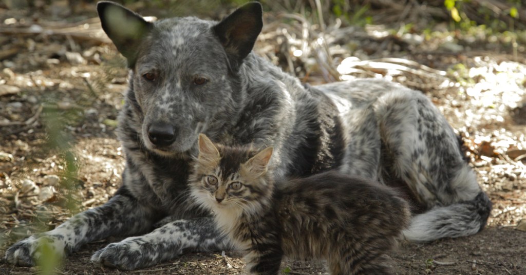 Max, a cattle dog, has become best friends with Ralphee, a tailless kitten who suffers from feline cerebellar hypoplasia, a neurological disorder resulting in underdeveloped motor skills and poor coordination. The feline was rescued from a barn horse stable.
